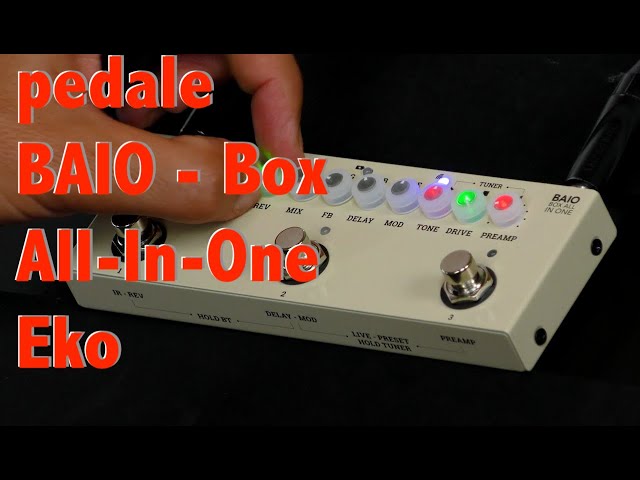 Il BAIO (Box All In One) di Eko Guitars è il pedale multieffetto completo e portatile, perfetto per la tua chitarra. Grazie ai nove tipi di preamplificatore integrati, agli otto Impulse Response e agli effetti inclusi, avrai la possibilità di gestire completamente il tuo sound. Provalo come scheda audio con il tuo pc o smartphone e sfrutta il BT per suonare sopra le tue backing track.Grazie ai suoi 16cm di lunghezza, appena 6cm di larghezza e 260g di peso, BAIO è il sistema multieffetto all-in-one in grado di offrire tutte le caratteristiche e funzionalità indispensabili al chitarrista moderno. Facile da traportare e super resistente grazie allo chassis metallico, consente una gestione totale del proprio sound.Con nove tipologie di preamplificazione selezionabili e controllabili con le manopole Tone e Drive, avrai accesso ad altrettante timbricità che spaziano dai puliti cristallini alle distorsioni più pesanti. La sezione delle modulazioni, accessibile tramite il controllo Mod, consente di aggiungere chorus e phaser; delay con relativa gestione del tempo, delle ripetizioni, della quantità ed effetto riverbero, sono accessibili rispettivamente con le manopole Delay, FB, Mix e Rev. La manopola IR consente di selezionare fra otto Impulse Response creati appositamente per BAIO da Massimo Varini, il quale ha selezionato e adattato alcuni fra i migliori IR marcati ChopTones. Dal Blues al Metal avrai la possibilità di utilizzare live e in studio una selezione di amplificatori, cabinet, speaker e microfoni appositamente combinati per offrire un suono realistico e convincente. Con il controllo Out gestisci il volume in uscita e tramite i tre pulsanti a pedale potrai passare dalla modalità Preset per il cambio degli stessi, alla modalità Live che ti permetterà di gestire separatamente IR/Rev, Delay/Mod e Preamp. Sempre con gli switch a pedale, puoi azionare il Bluetooth che ti consentirà di riprodurre le tue backing track preferite tramite un device esterno o attivare l'accordatore integrato, con il quale è possibile anche interrompere completamente il segnale in uscita (mute).Il pannello posteriore presenta due terminali jack standard per l'ingresso e l'uscita, l'interruttore d'accensione, la presa USB per l'alimentazione del pedale e la ricarica della batteria, la connessione al computer per l'utilizzo come scheda audio e il caricamento di nuovi IR. Con la presa Phone è possibile utilizzare l'apposito cavo per collegare lo Smartphone e utilizzare BAIO come scheda audio anche sul proprio telefono. E' presente altresì un'uscita per le cuffie che ti consentirà di ascoltare contemporaneamente il segnale dello strumento e un eventuale riproduzione Bluetooth.
