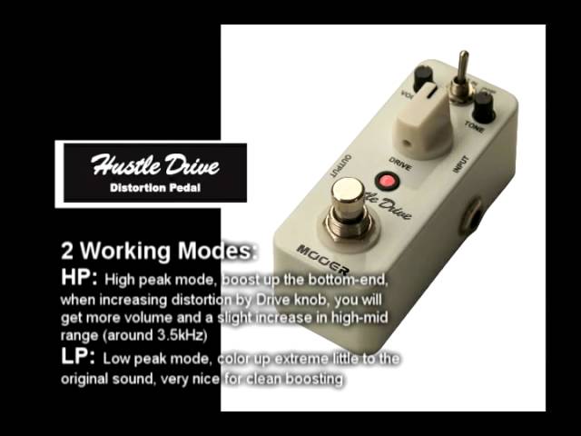 Overdrive Analogico Hi-Gain True Bypass. E' un pedale dall'incredibile range dinamico e dallo straordinario suono valvolare. La modalità HP (High Peak Mode) enfatizza la fascia bassa. Quando si aumenta la distorsione dalla manopola Drive, si otterrà più volume ed un leggero aumento nelle frequenze medio-alte (circa 3,5kHz). La modalità LP (Low Peak Mode) colora poco il suono originale, molto bello per enfatizzare i suoni puliti.