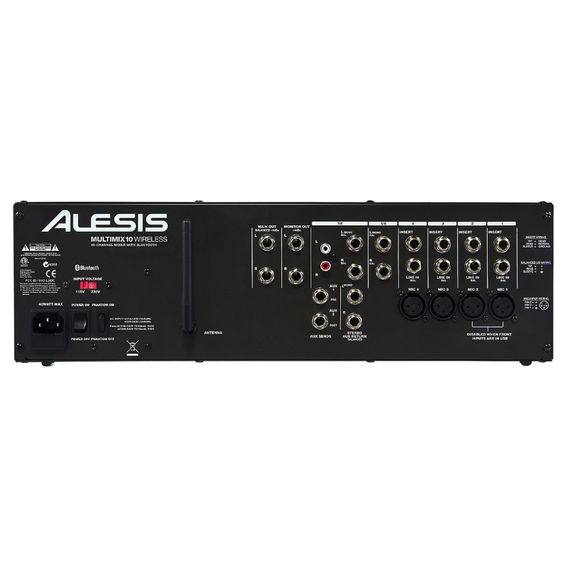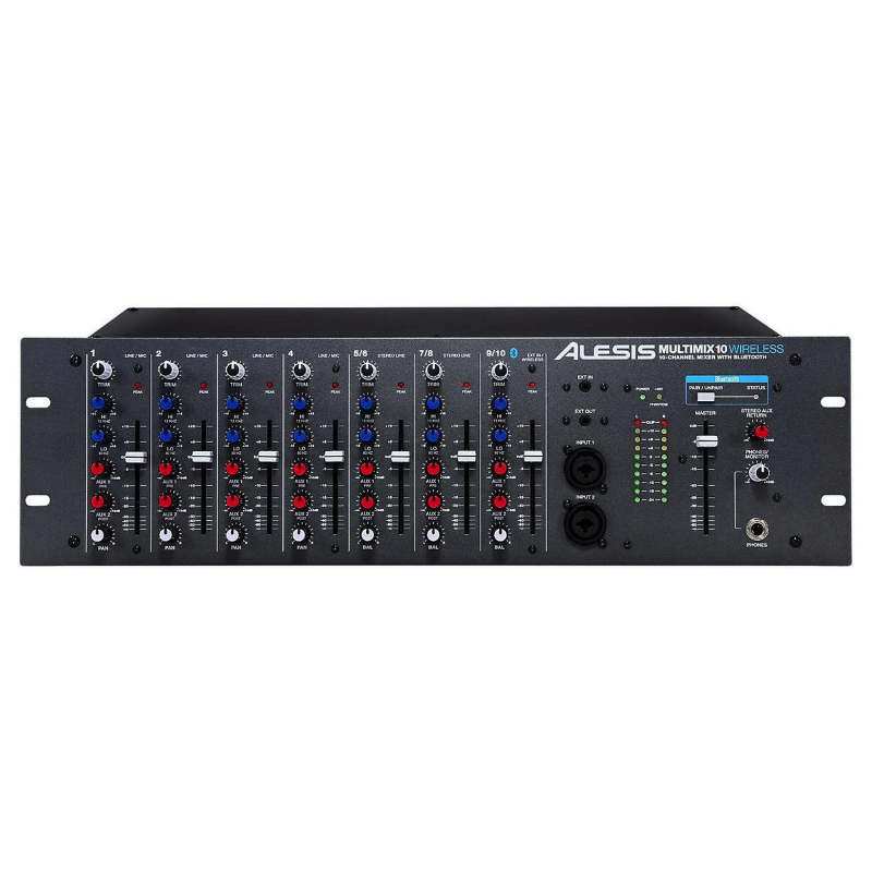 MultiMix 10 Wireless è un mixer 10 canali (4 mono e 3 stereo) dall'ingombro di 3 unità rack che supporta la tecnologia Wireless Bluetooth per ricevere sul canale 9/10 il segnale audio generato da lettori compatibili (cellulari, iPad, iPhone, iPod touch e computer). L'antenna in dotazione è installabile nel retro del mixer, mentre la configurazione del device Bluetooth è fattibile usufruendo del tasto dedicato (Pair/Unpair) presente nell'area master del mixer. Sui canali mono (dall'1 al 4) sono disponibili ingressi XLR microfonici (con alimentazione phantom) e jack da 1/4" per sorgenti line, con connessioni insert TRS per il collegamento diretto di processori hardware esterni. Una particolarità di questo mixer a rack è la presenza di due connettori combo (Jack/XLR) collocati nel pannello frontale, i quali consentono di sostituire quelli presenti nel retro, quindi utilissimi per i collegamenti rapidi, senza dover ricorrere allo smontaggio dal rack, o allo scollegamento dei cavi. I canali stereo (5/6 e 7/8) dispongono di connettori Jack da 1/4" e sono consigliati per il collegamento di sorgenti line (tastiere, lettori CD, sintetizzatori, etc); il canale 7/8 offre anche una coppia (L/R) di connettori RCA. Ogni canale ha un fader da 6cm, led per il monitoraggio del picco, trim, EQ 2-bande, pan e due mandate (Aux 1 e Aux 2) operanti rispettivamente in pre e post fader. Uscita master su connettori Jack da 1/4" bilanciati (TRS) e monitor out sempre formato Jack (L/R). Sull'uscita Master è presente un fader per il controllo del volume e un led stereo multi-segmenti. Nel pannello frontale dell'Alesis MultiMix 10 Wireless troviamo inoltre un'uscita cuffia con controllo di volume dedicato e due connessioni mini-jack da 1/8", rispettivamente un ingresso "fisico" line ausiliare per il canale 9/10 (alternativo al Bluetooth) e un'uscita master direttamente accessibile dal pannello frontale e utile per il collegamento a registratori portatili o altri device per la registrazione audio.