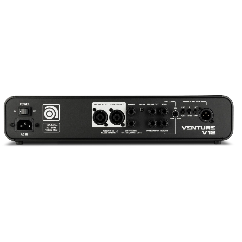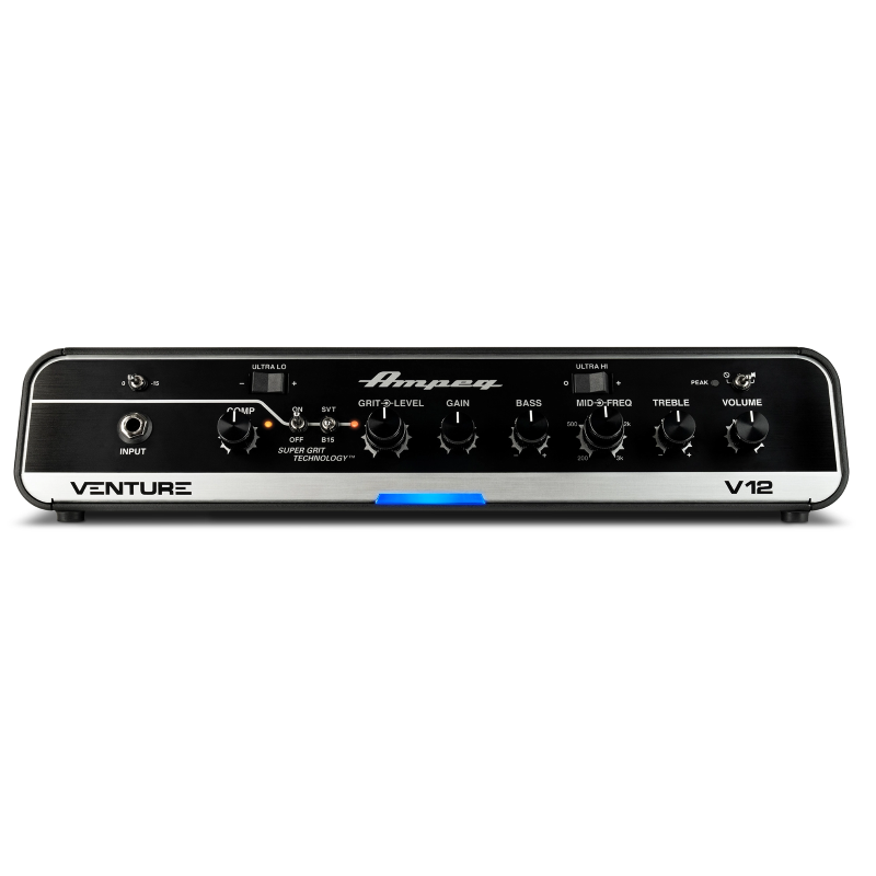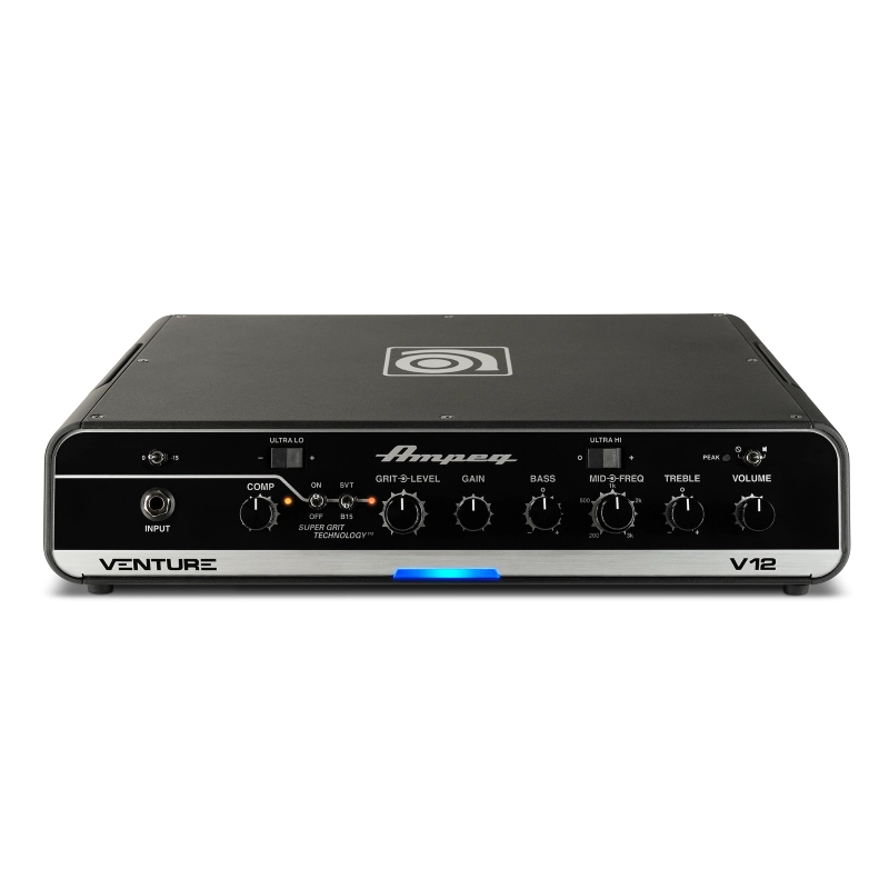 Ampeg Venture V12; amplificatore a transistor, top per basso elettrico; Potenza: 1200 watt, 4 Ohm; voicings SVT e voicings B15; Controlli: 1x compressor, 1x grit e level for overdrive, 1x gain, EQ a 3 bande con controlli per medi, bassi, basso, volume, 1x, FX mix dry/wet; interruttori: Ingresso 0/-15 dB, Ultra Hi- e 3-way Ultra Lo switch, circuito 1x Overdrive, 1x SVT e B15 Voicing, Speaker/lineout Mute, Balanced XLR con Pre/Post EQ, Ground Lift e 0/-20 dB switch; Effetti: Super Grit Overdrive; percorsi di inserimento effetto: invio e ritorno; connessioni: Input (jack da 6,3 mm), Aux In da 3,5 mm; Uscite altoparlanti: Dual Kinke/Speakon; Telefoni; Preamplificatore Out; Power Amp In; Bilanciato DI-Out