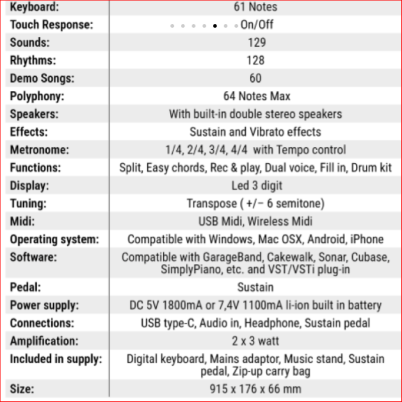 Modello dal design compatto, ideale sia per principianti che per musicisti esperti. 61 tasti sensibili al tocco, che offrono una sensazione simile a quella di un pianoforte.