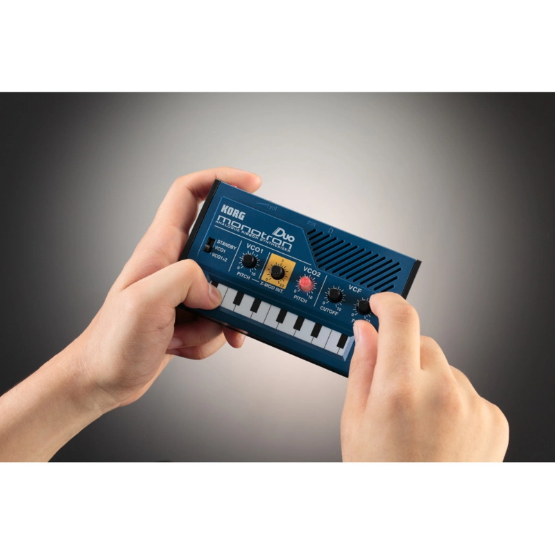 Con i suoi due oscillatori, il monotron DUO aggiunge una marcia in più al classico suono monotron, per creare suoni potenti e complessi. Il circuito di Cross Modulation "X-MOD" derivato dal classico synth Korg Mono/Poly ti permette di creare sonorità ancor più particolari, dal vibrato a suoni estremamente metallici, che fanno tornare alla mente la sintesi FM. La tastiera ribbon del monotron DUO, derivata dal KAOSSILATOR, offre una funzione in più rispetto agli altri modelli: si può infatti utilizzare un pulsante per selezionare una delle 4 scale disponibili: Cromatica, Maggiore, Minore, o Wide. Il suono di un filtro analogico (VCF) può arricchire e modificare radicalmente un timbro. monotron DUO impiega lo stesso circuito VCF degli storici synth semi-modulari KORG MS-10 e MS-20 realizzati 30 anni fa. Il potenziometro Cutoff del VCF permette di selezionare il punto di taglio del filtro passa basso, mentre quello Peak controlla la risonanza. L'ingresso mini-jack "Aux In" permette di collegare qualsiasi sorgente audio esterna, come un Kaossilator, una chitarra, o un lettore CD e/o mp3, per poterla così processare mediante il filtro passa basso risonante disponibile nei prodotti della famiglia monotron.