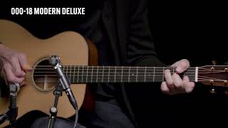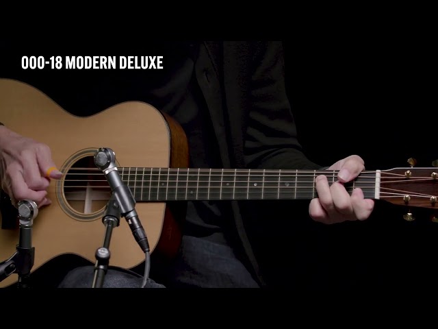 La 000-18 Modern Deluxe è la chitarra acustica con forma 000 della serie "Modern Deluxe" di Martin & Co. realizzata con top in Abete con trattamento VTS, fasce e fondo in Mogano, manico in Mogano e tastiera in Ebano, caratterizzata dall'elegante binding in Acero fiammato europeo. Si distingue per i tasti gold, meccaniche aperte gold, truss rod in titanio, piastra del ponte in fibra di carbonio e pin del ponte Liquidmetal®.