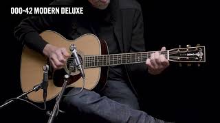 La 000-42 Modern Deluxe è la chitarra acustica con forma 000 della serie "Modern Deluxe" di Martin & Co. realizzata con top in Abete con trattamento VTS, fasce e fondo in Palissandro Indiano, manico in Mogano e tastiera in Ebano, caratterizzata dall'elegante binding in Acero fiammato europeo. Si distingue per i tasti gold, meccaniche aperte gold, truss rod in titanio, piastra del ponte in fibra di carbonio e pin del ponte Liquidmetal®.