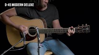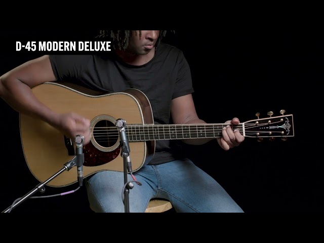 La D-45 Modern Deluxe è la chitarra acustica con forma dreadnought della serie "Modern Deluxe" di Martin & Co. realizzata con top in Abete con trattamento VTS, fasce e fondo in Palissandro Indiano, manico in Mogano e tastiera in Ebano, caratterizzata dall'elegante binding in Acero fiammato europeo. Si distingue per i tasti gold, meccaniche aperte gold, truss rod in titanio, piastra del ponte in fibra di carbonio e pin del ponte Liquidmetal®.