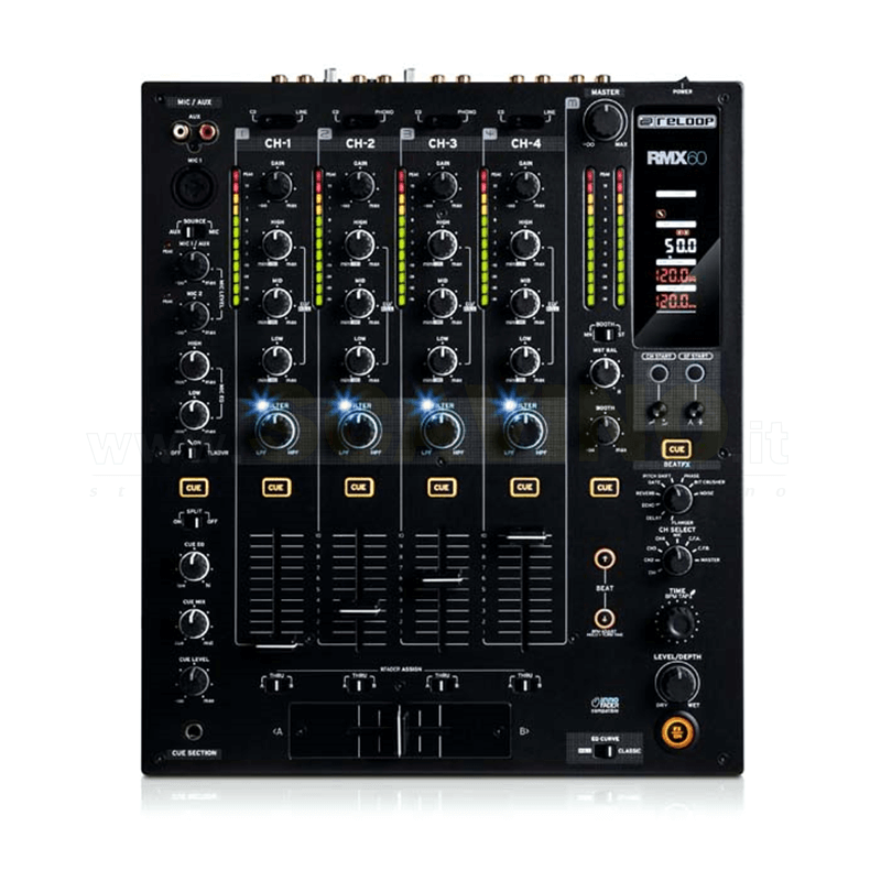 RMX-60 Digital è un mixer digitale professionale di altissima qualità per DJ. La vasta gamma di connessioni, la costruzione robusta, l'architettura audio completamente digitale e il classico design a 4+1 canali, rendono RMX-60 Digital il mixer ideale per l'utilizzo nei club e perfetto per le esigenze dei moderni DJ. SEZIONE EQ PERSONALIZZABILE Per soddisfare differenti stili di mixaggio, la sezione EQ di RMX-60 Digital offre due modalità di funzionamento: Classic e Isolator. In aggiunta, sotto all'equalizzatore a tre bande di ciascun canale, è posizionato un filtro bipolare con curve dedicate alle alte e basse frequenze. NUOVA SEZIONE EFFETTI Ispirata al mixer RMX-80 Digital di Reloop, la sezione effetti di RMX-60 Digital include ben 8 effetti professionali - tra cui Delay, Echo, Reverb, Gate, Pitch Shift, Phase, Bit Crusher e Noise, in grado di offrire spunti creativi illimitati ed eseguire remix in tempo reale durante i set. Il routing flessibile consente di assegnare gli effetti singolarmente all'ingresso microfonico, ad uno dei 4 canali line/phono, oppure al canale master. AMPIO DISPLAY L'ampio display LCD visualizza le informazioni più importati e facilità il controllo dei parametri durante le sessioni maggiormente creative. Il doppio BPM counter consente di verificare la velocità dei brani per ottenere mixaggi più precisi. FUNZIONALITA' AVANZATE RMX-60 dispone di molteplici funzionalità avanzate tra cui la curva regolabile di canali e crossfader, faderstart, modalità "Active Ducking Technology" per l'ingresso microfonico e possibilità di aggiornamento firmware tramite tramite porta USB.