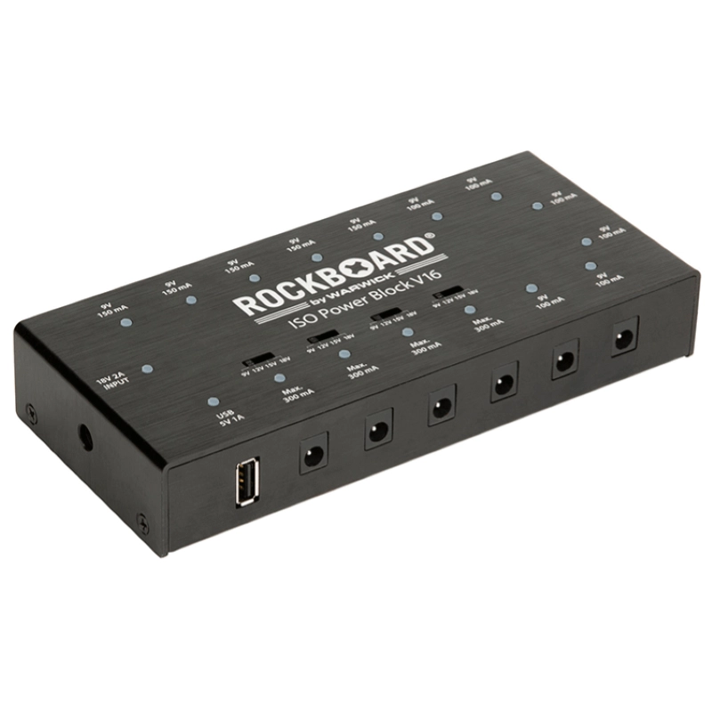 RBO POW BLOCK ISO 16 - Alimentatore per pedali effetto - 16 uscite completamente isolate - Potenza totale: 3.550 mA - Uscite: 6x Uscita 9V DC (100 mA) con LED di stato individuali e protezione da corto circuito + 5x Uscita 9V DC (150 mA) con LED di stato individuali e protezione da corto circuito + 4x Uscita 9V/12V/15V/18V DC Selezionabile muovendo l'apposito selettore (300 mA/200 mA/180 mA/150 mA) con LED di stato individuali e protezione da corto circuito + 1x Uscita USB 5V DC (1000 mA) con LED di stato individuali e protezione da corto circuito - Circuito di protezione contro i sovraccarichi - Cavi in dotazione: 16x Cavo 60cm per alimentare DC un pedale effetto + 1x Cavo a Y blu per combinare due uscite raddoppiando il voltaggio + 1x Cavo a Y bianco per combinare due uscite raddoppiando l'amperaggio + 1x Cavo USB charging (USB Micro-B/USB Type-A) - Alimentatore esterno 18V DC 2.000 mA incluso (impedisce interferenze a bassa frequenza) con adattatori di spina intercambiabili (EU, UK, US/CA e AU/NZ) - Mutipower 100/230 V - Colore: nero - Dimensioni: 17,8x8,0x3,0cm - Peso: 0,40Kg.