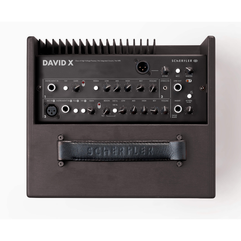 DAVID X è ideale per chi cerca un'amplificazione per strumenti acustici senza compromessi. Un sistema efficace per la prove a casa, con la band e per l'uso in studio, le dimensioni di DAVID X lo rendono anche il modello di amplificatore SCHERTLER più portatile e flessibile. Ai tre ingressi possono essere collegati due strumenti, oppure uno strumento e un microfono per la voce, più un dispositivo di riproduzione (playback) stereo.
