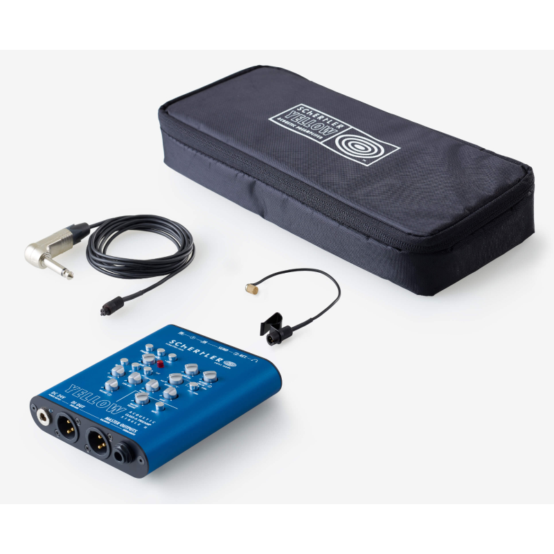 - STAT V ROAD combines the STAT V pickup for violin and viola with the YELLOW BLENDER, a versatile, portable, 2-channel Class-A preamplifier. The package includes a connection cable and padded bag. * Consists of the STAT-V violin & viola pickup and the Yellow Single preamplifier * Electrostatic violin pickup * High dynamic range and high linearity * Simple and quick mounting * Greatly reduces feedback sensitivity due to the bridge pickup * The Schertler Yellow Single preamplifier offers a modern design in a lightweight aluminium housing * 2 Input channels for all types of microphones and pickups * 4 Outputs with multiple connection options * Headphone output * Loop for effects with send & return * 4-Band EQ with extra filters for maximum tone control and flexibility * High-end Class A electronics for the best possible sound performance * Made in Switzerland