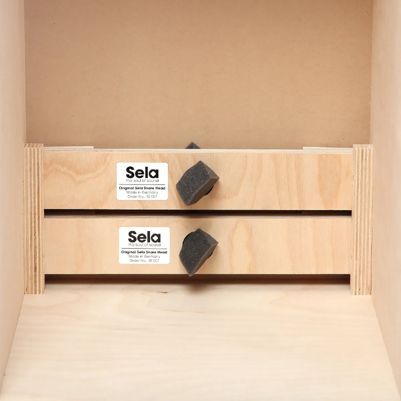 Per chi non ne ha mai abbastanza del suono del rullante Sela! Grazie al sistema Sela Snare, è possibile inserire una seconda pelle per rullante Sela. In questo modo si ottiene un suono più potente. Questa soluzione è particolarmente apprezzata dai musicisti di flamenco, per i ritmi latini e per i musicisti che generalmente preferiscono un suono "croccante" e deciso. È possibile utilizzare il piccolo cuneo in schiuma per modificare il suono dell'effetto rullante.