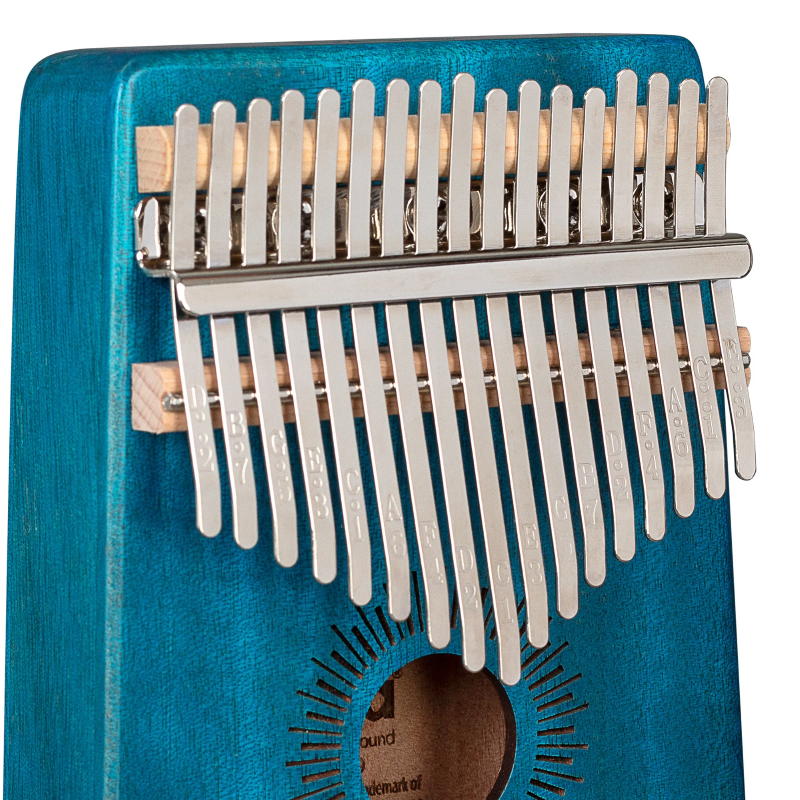 La Kalimba Sela 17 in blu è realizzata in legno di mogano di alta qualità. Il corpo amplifica le basse frequenze e produce un suono pieno, chiaro e caldo con una risonanza affascinante. I tasti in metallo di alta qualità sono accordati in Do maggiore e hanno un'estensione da Do´ a Mi´´ (Do4 – Mi6). Le note stampate sui tasti rendono la Kalimba adatta sia ai principianti che ai musicisti più esperti.