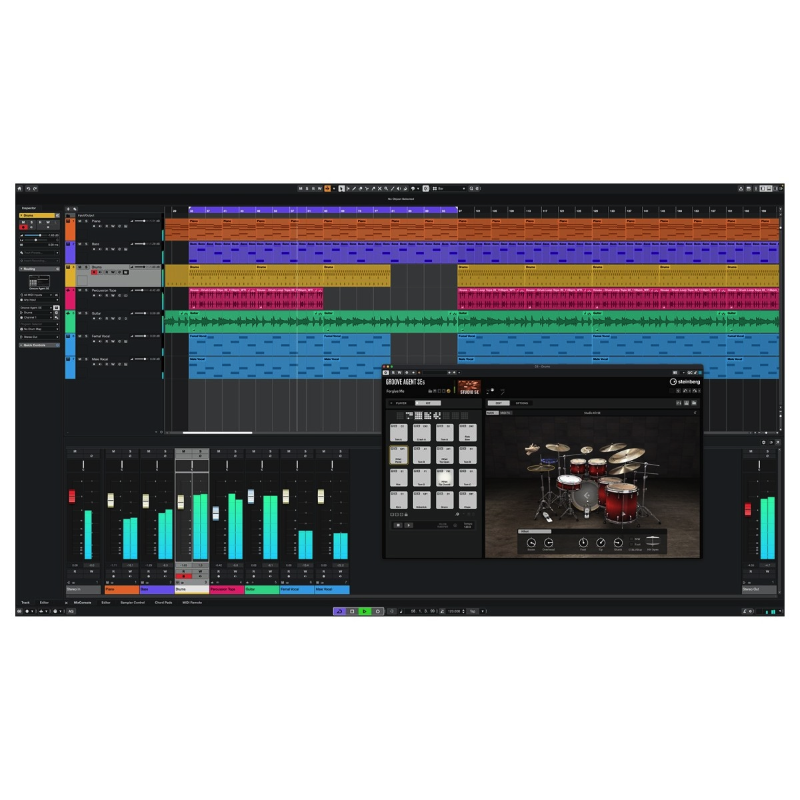 Il workflow è stato migliorato con automazioni intelligenti, un Hub ridisegnato e plug-in completamente ridimensionabili. La dotazione sonora include la HALion Library con sintetizzatori vintage e moderni, drum kit, loop, campioni multi-genere e Chord Pads con 30 preset. Tra i plug-in avanzati trovi UltraShaper e Pitch Shifter, strumenti potenti per modellare dinamica e intonazione.
